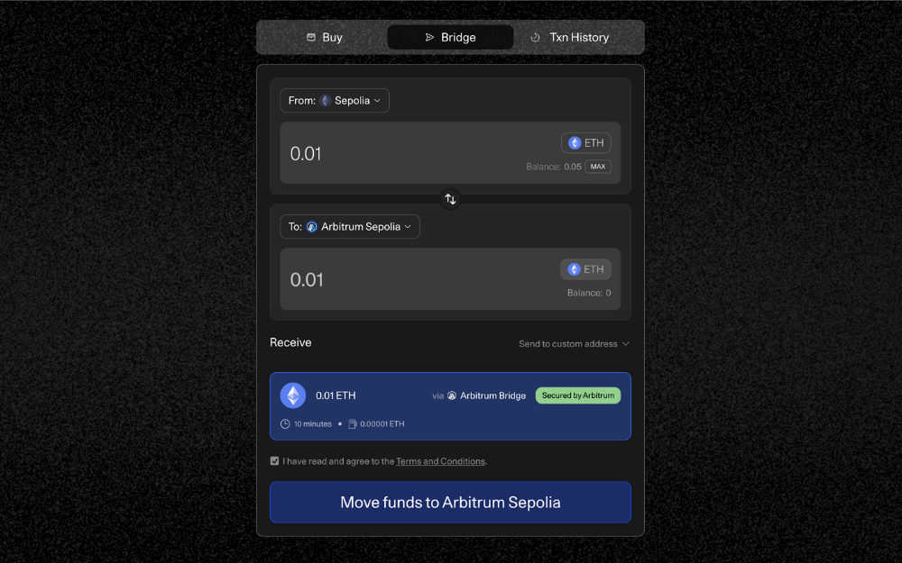 Bridging means transferring funds from on chain onto another. Go to the bridge for your desired network, I mostly use Superbridge for Base Sepolia and Unichain Sepolia, and Arbitrum Portal for Arbitrum Sepolia. It is normal for this process to take a while.