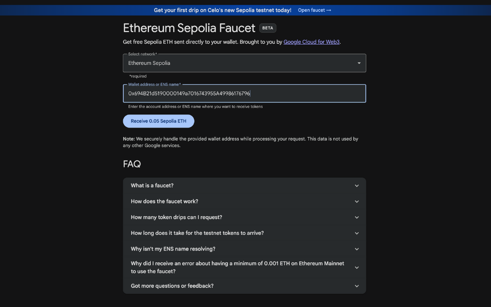 Now you'll need some testnet ETH, which is completely free, to be able to create products on our console (Note: When creating a product later on, you'll need to pay a small fee of about $0.05 depending on the chain. But this fee doesn't go to us, but to the validators who keep the blockchain up and running). My favorite way to get testnet ETH is Googles Web3 Faucet, because it doesn't requires you to have ETH on mainnet. It drops 0.05 ETH on Ethereum Sepolia, which is more than enough for our needs. But it is not on the right network yet, so we need to bridge it.