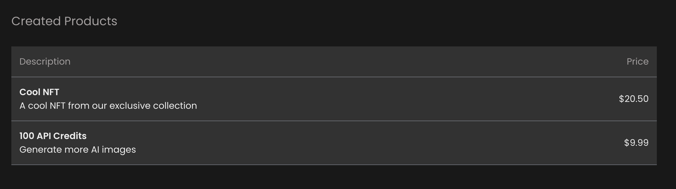 Note: You can change the values provided above after product creation, you just need to click on the product row under Created Products and click edit.