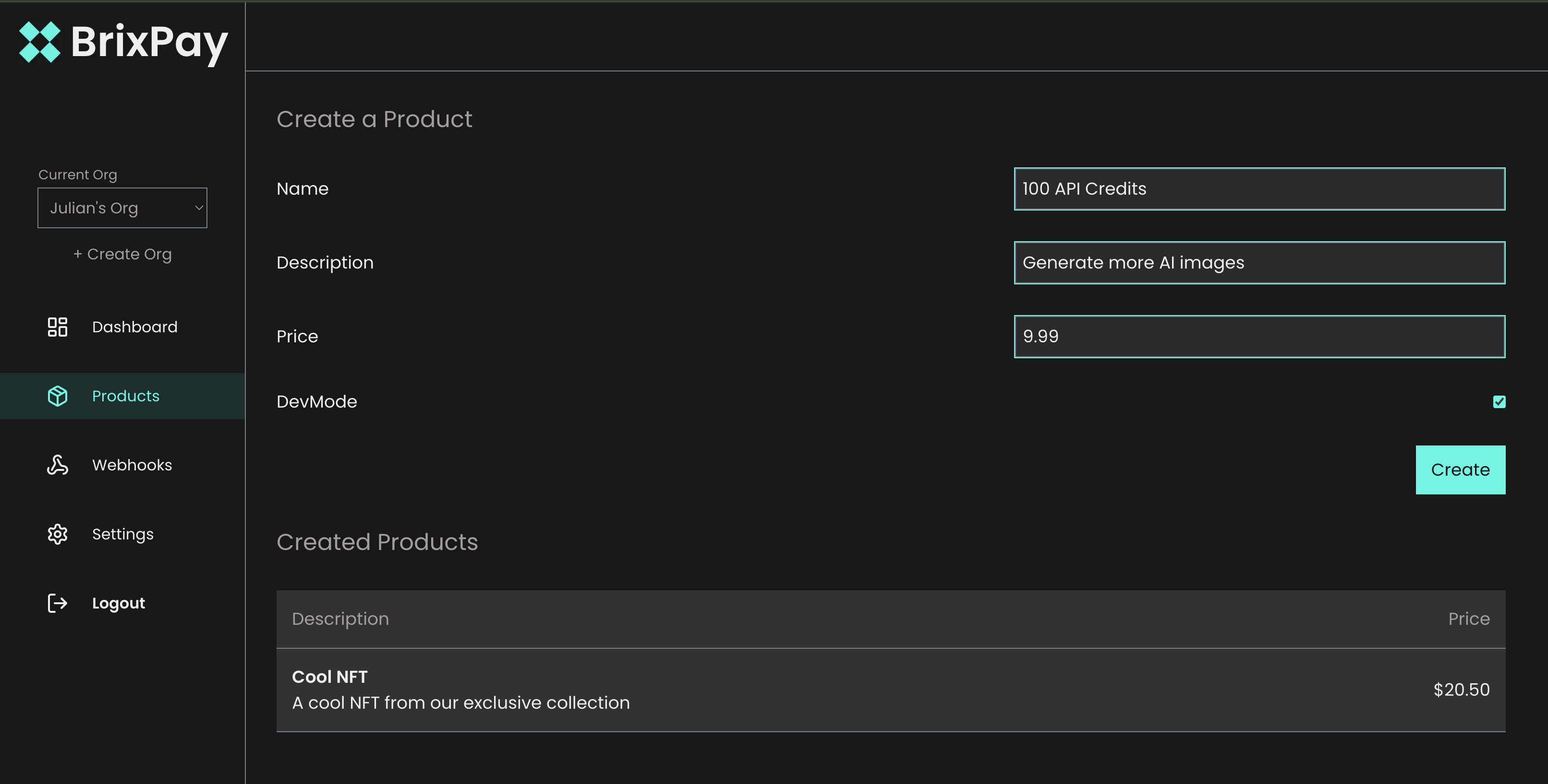 After completing the steps in Getting Started, you can finally create your first product in the BrixPay Console. When you connected your wallet, you need to go to /products, where you'll see a product creation form, and below that your created products: